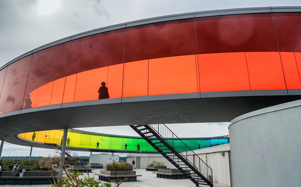 What captures the eye immediately is the circular skywalk—“Your Rainbow Panorama” by Olafur Eliasson—sitting atop the building like a surreal crown. Before even stepping inside, the presence of this elevated ring of color creates an irresistible draw. It hovers over the city like a spaceship, refracting the northern light in shifting hues of green, red, violet, and orange.
